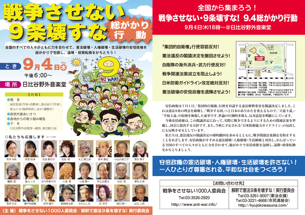 〈主催〉戦争させない1000人委員会/解釈で憲法9条を壊すな!実行委員会*デモ出発:午後7時15分(銀座方面)